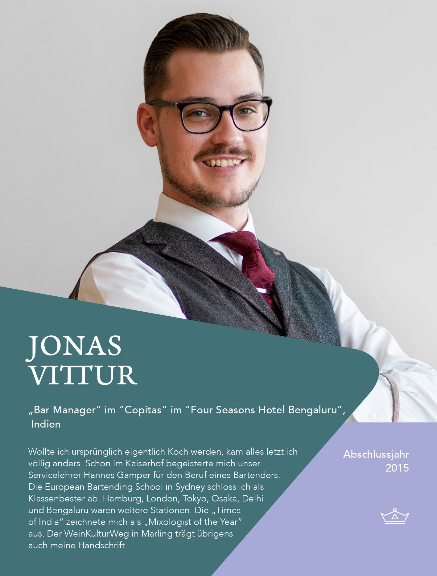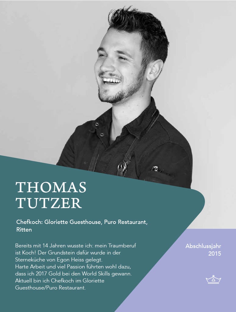 Nach dem Schulabschluss war Vincent viel unterwegs: ein paar Wochen in der Schweiz (in einem Nobelhotel an der Rezeption, im Service, in der Küche), ein paar Wochen Zeit für sich und ein tolles Fotoprojekt abgewickelt. Seit einiger Zeit arbeitet er im Restaurant Miil im Kränzelhof in Tscherms und ist dort sehr zufrieden, da die Küche seine Leidenschaft ist.