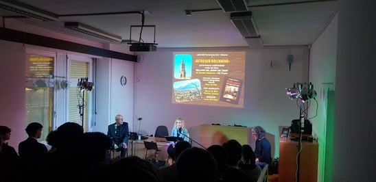 NEW EOS PERFORMING ARTS heißt die Gruppe, die uns mit Sprache, Bildern und Live-Musik eine multimediale Buchpräsentation mit dem Titel „Affresco Bolzanino“ dargeboten hat. Die Künstlergruppe setzt sich aus Mara Da Roit, Patrizio Zindaco und Luca dall’Asta zusammen. Als Vorlage für die Aufführung dient das Buch „Bolzano nel segno dei tempi“, geschrieben von Prof. Claudio Calabrese. Er lebt und arbeitet in Meran als Lehrperson an unserer Schule, ist u.a. Künstler, Journalist und Schriftsteller.