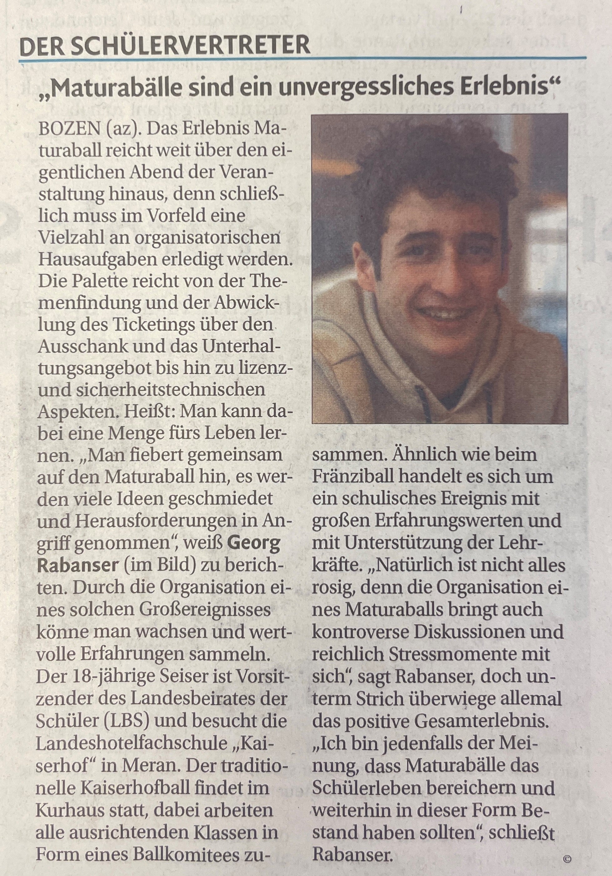 Maturabälle sind ein unvergessliches Erlebnis 28.01.2025 | Pressespiegel Dolomiten (29.01.2025) Dokumente zum Herunterladen 29.01.25_Dolomiten_Maturaball.jpg (1532 KB) »