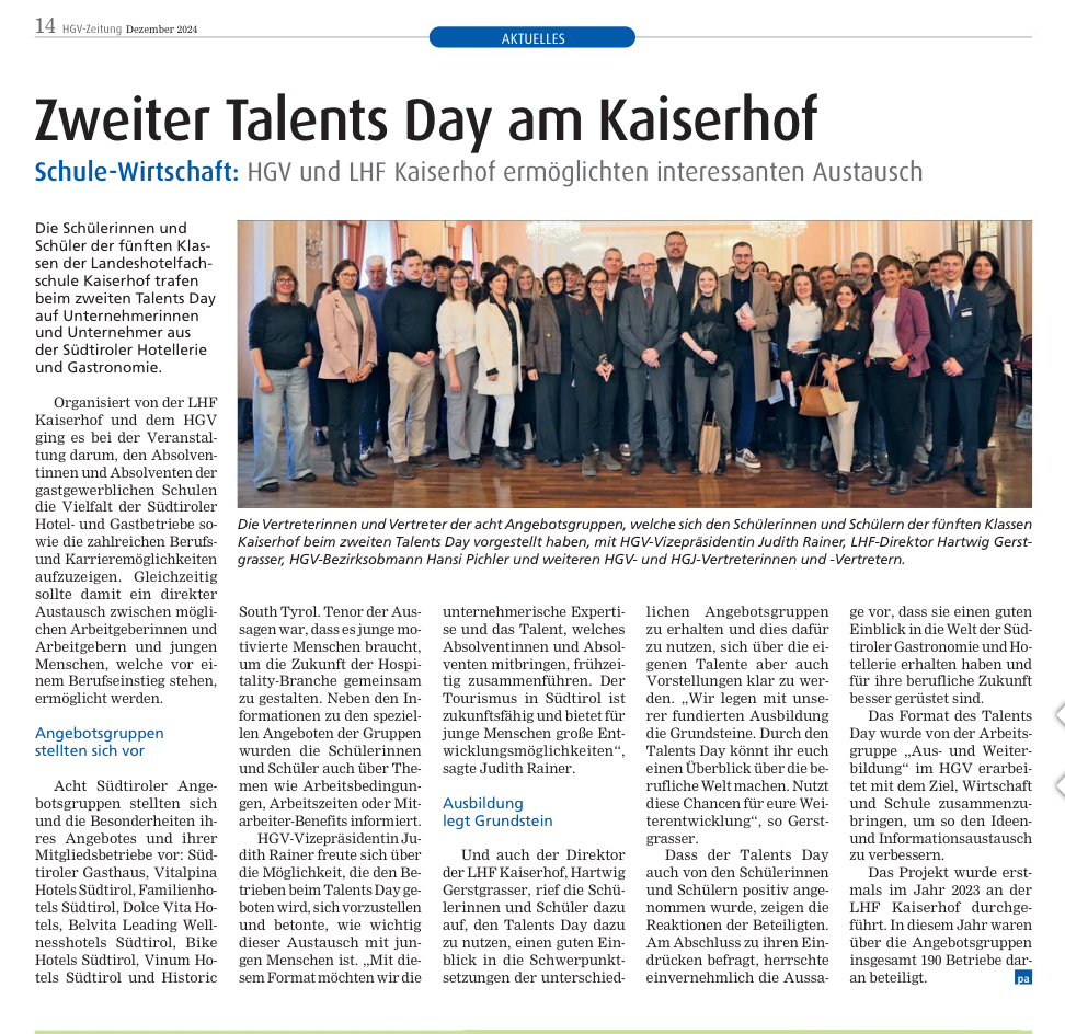 Zweiter Talents Day am Kaiserhof 11.12.2024 | Pressespiegel HGV-Zeitung Dezember 2024 Dokumente zum Herunterladen Zeitungsartikel Zweiter Talents Day am Kaiserhof (HGV-Zeitung - Dezember 2024) (779 KB) »