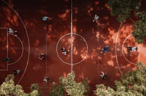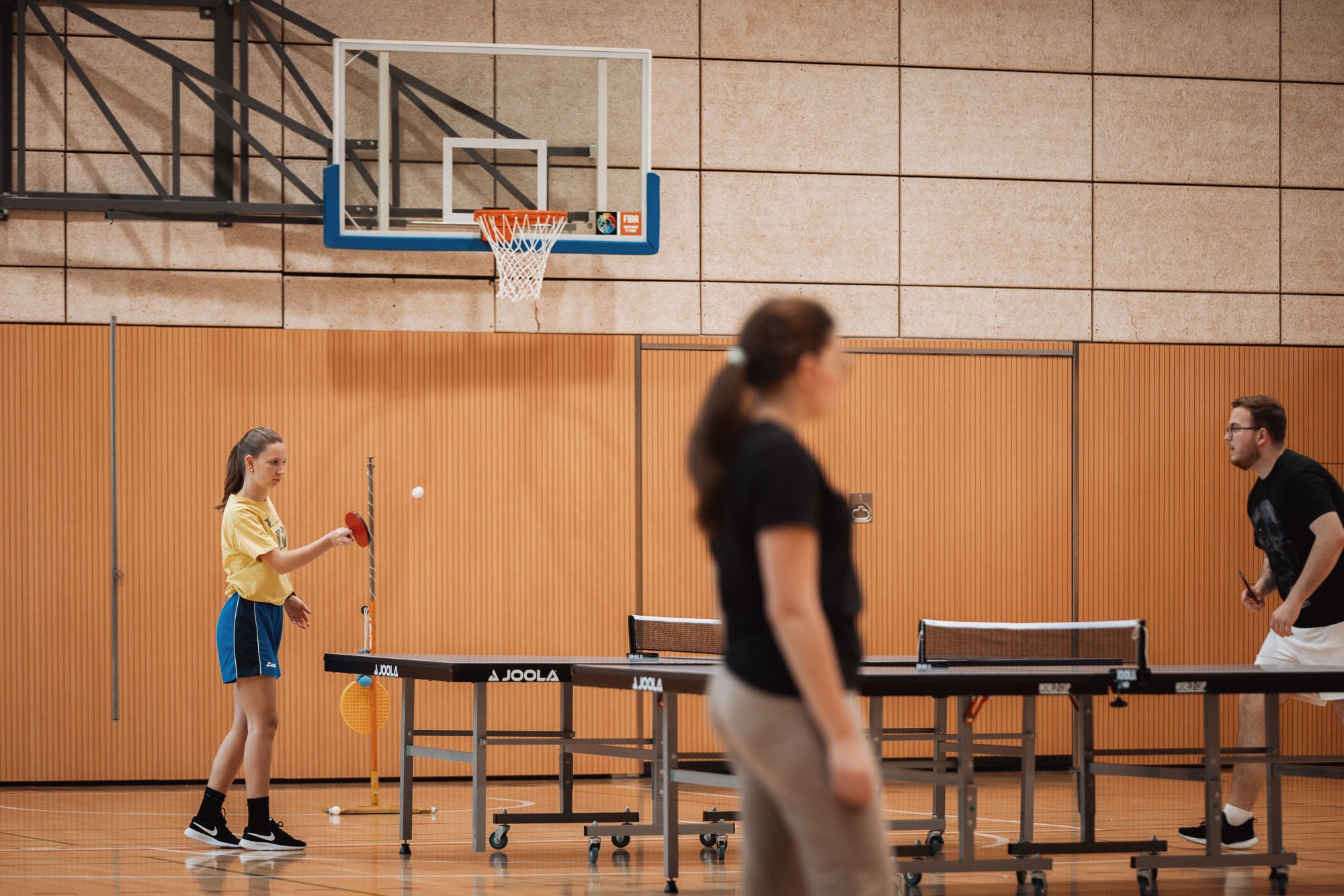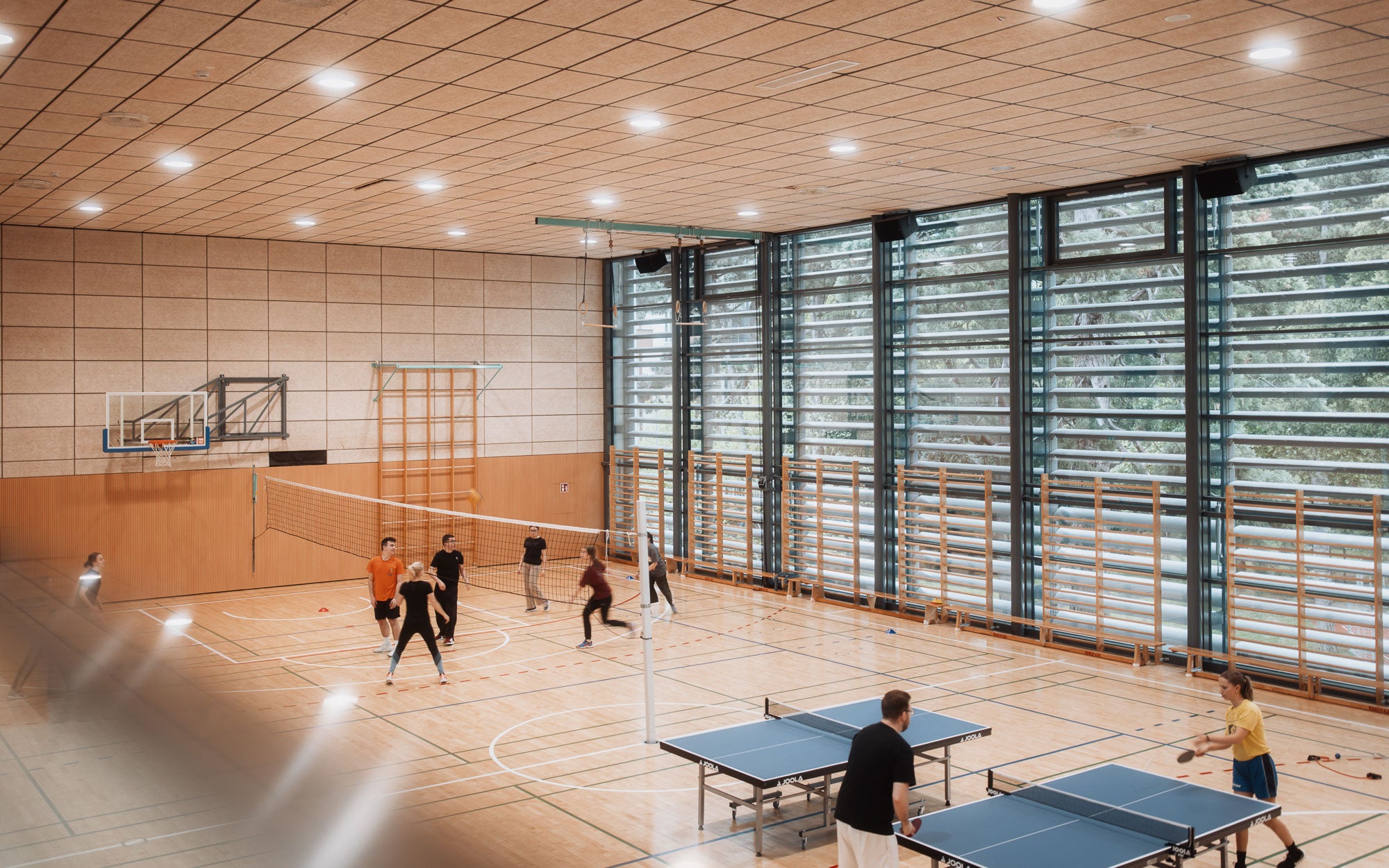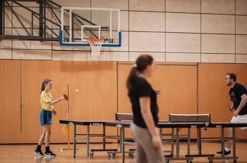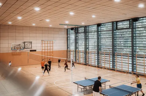 Im Außenbereich ergänzen ein Volleyballfeld und ein Tischtennisbereich das vielseitige Sportangebot.